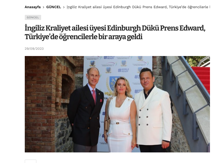 İngiliz Kraliyet ailesi üyesi Edinburgh Dükü Prens Edward, TBS-Tarabya İngiliz Okulları Kurucusu ve Horizon Group Başkanı, eğitim gönüllüsü Mehmet Gültekin'in daveti ve evsahipliğinde Türkiye’ye geçekleşen ziyareti sırasında öğrencilerle bir araya geldi.